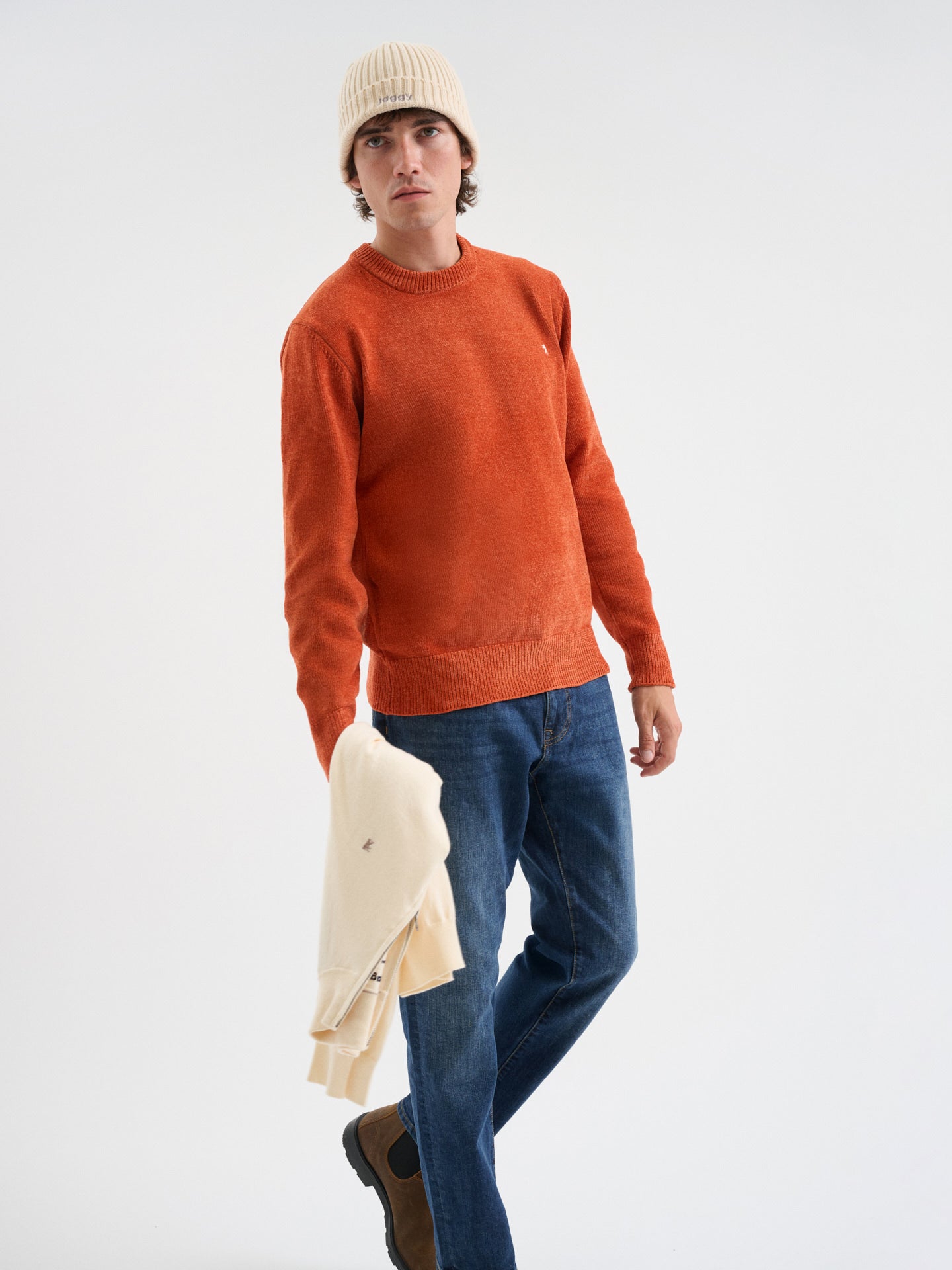 Maglia girocollo in ciniglia a maniche lunghe con costine sui polsi, fondo e collo e logo ricamato, regular fit