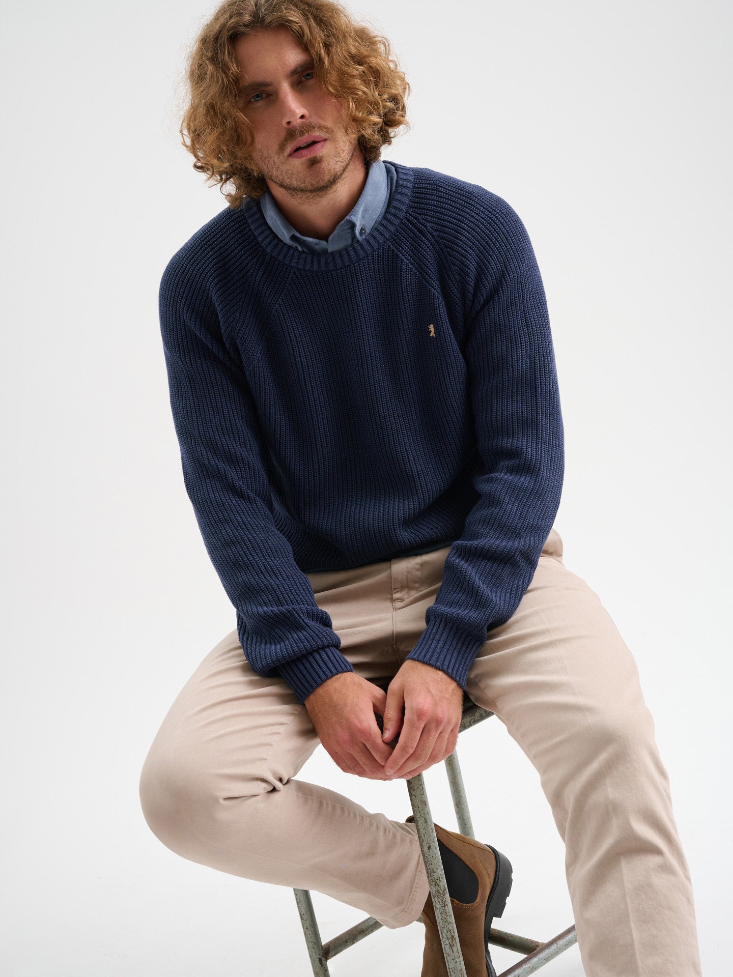 Maglia raglan girocollo a maniche lunghe con lavorazione a costa inglese in filato di cotone effetto stone, finiture a coste e patch logo ricamata - regular fit