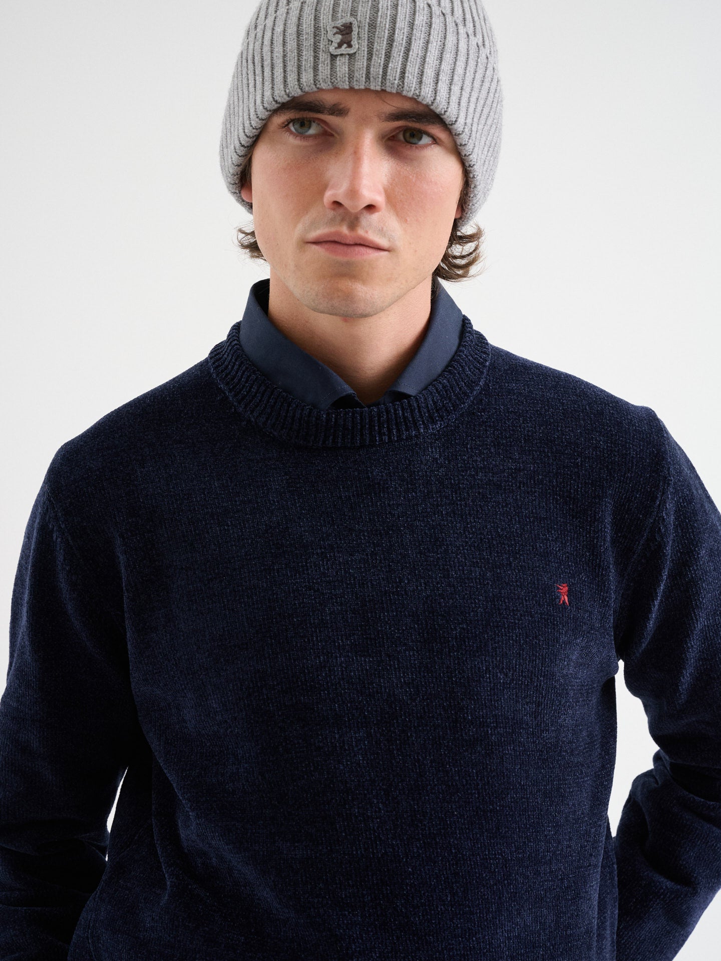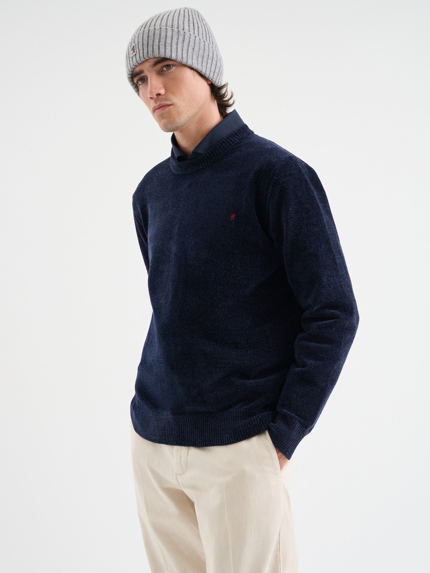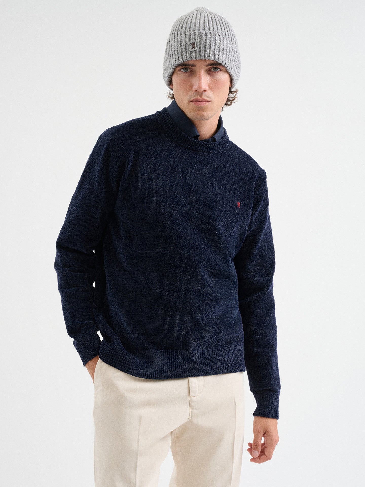 Maglia girocollo in ciniglia a maniche lunghe con costine sui polsi, fondo e collo e logo ricamato, regular fit