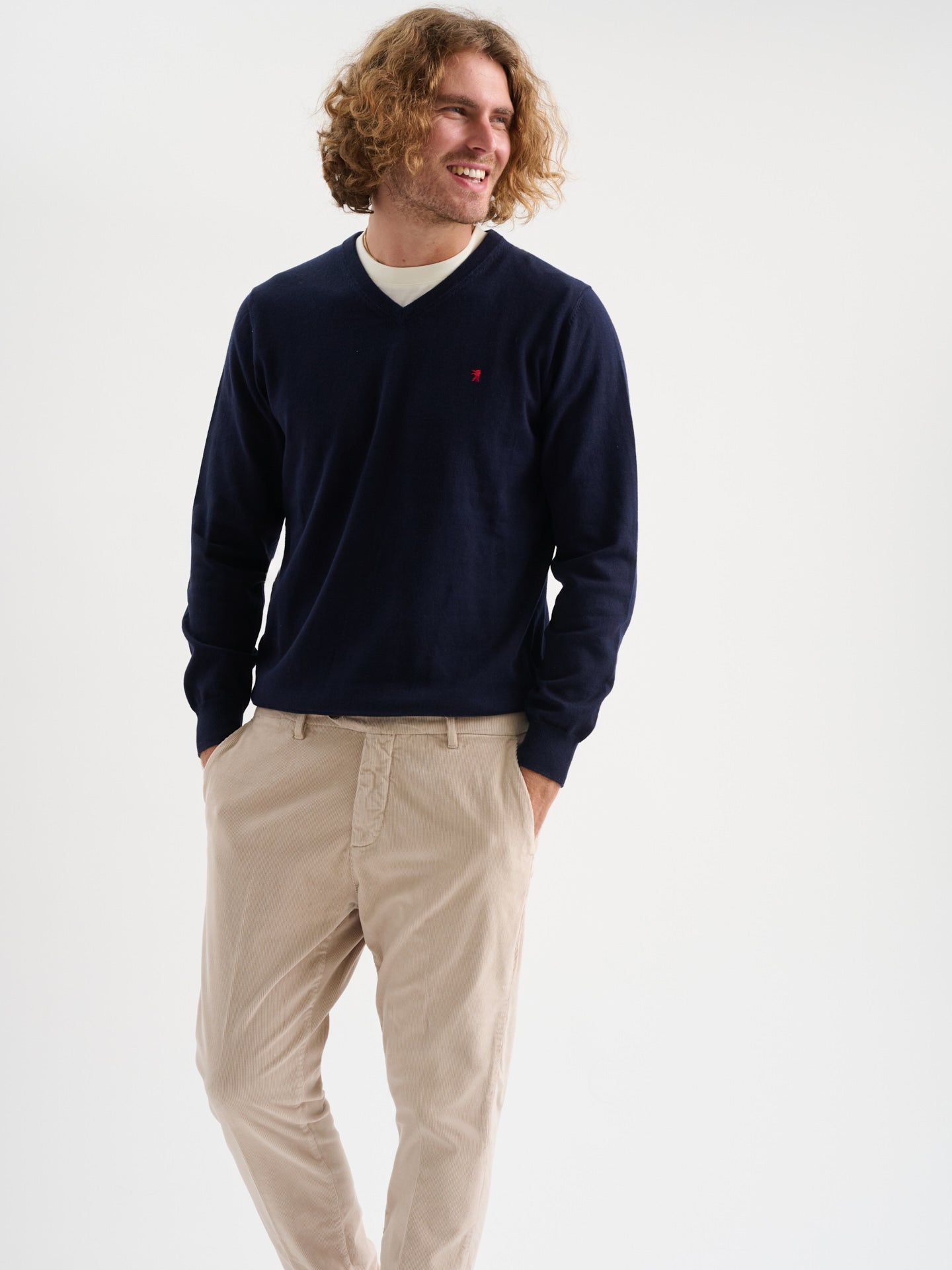 Maglia scollo a "v" a maniche lunghe in maglia rasata misto cotone - cashmere e logo ricamato, regular fit
